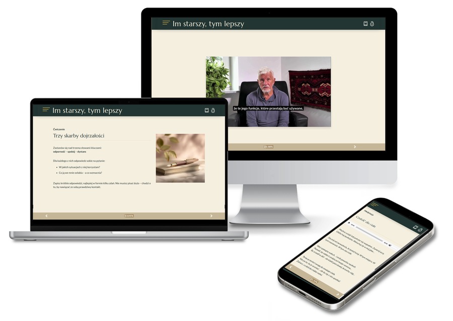 Z takiego myślenia powstał ten kurs. To nie kurs o udawaniu młodości, lecz zaproszenie, by przyjrzeć się temu, gdzie jestem dziś — w relacjach, w zdrowiu, w źródłach radości i sensu — i zobaczyć, co wciąż jest możliwe.